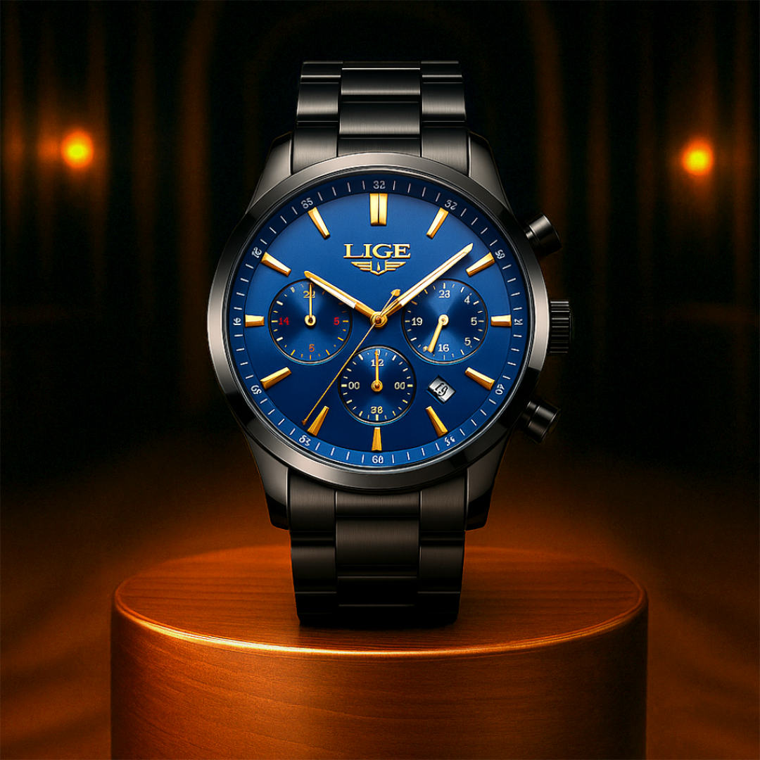 The Midnight Chrono commands attention with its deep blue dial contrasted by gold-tone indices and hands. Encased in sleek black stainless steel, it features triple sub-dials for precision timing, a date display at 4 o’clock, and a bold chronograph push-button system. Built for style and performance, it’s the perfect fusion of elegance and functionality.