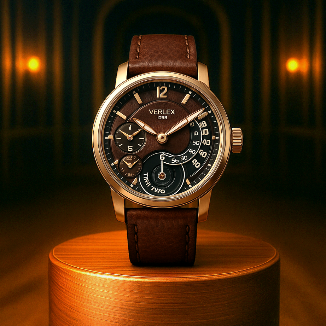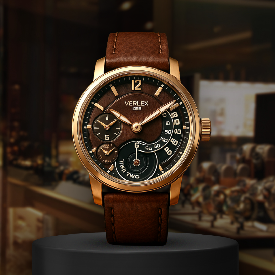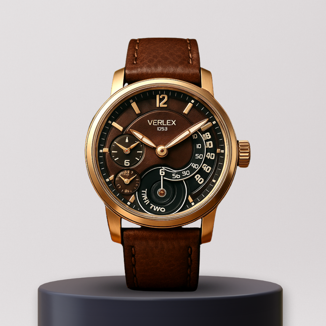 The Heritage Dual Time blends vintage charm with modern precision. Encased in warm bronze, its espresso-brown dial features dual sub-dials for tracking separate time zones, accented by gold-tone indices and a unique arc-shaped seconds counter. The stitched leather strap enhances its classic appeal, making it a refined companion for travelers and connoisseurs alike.