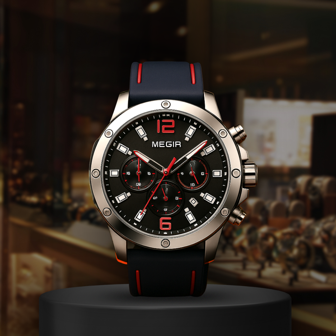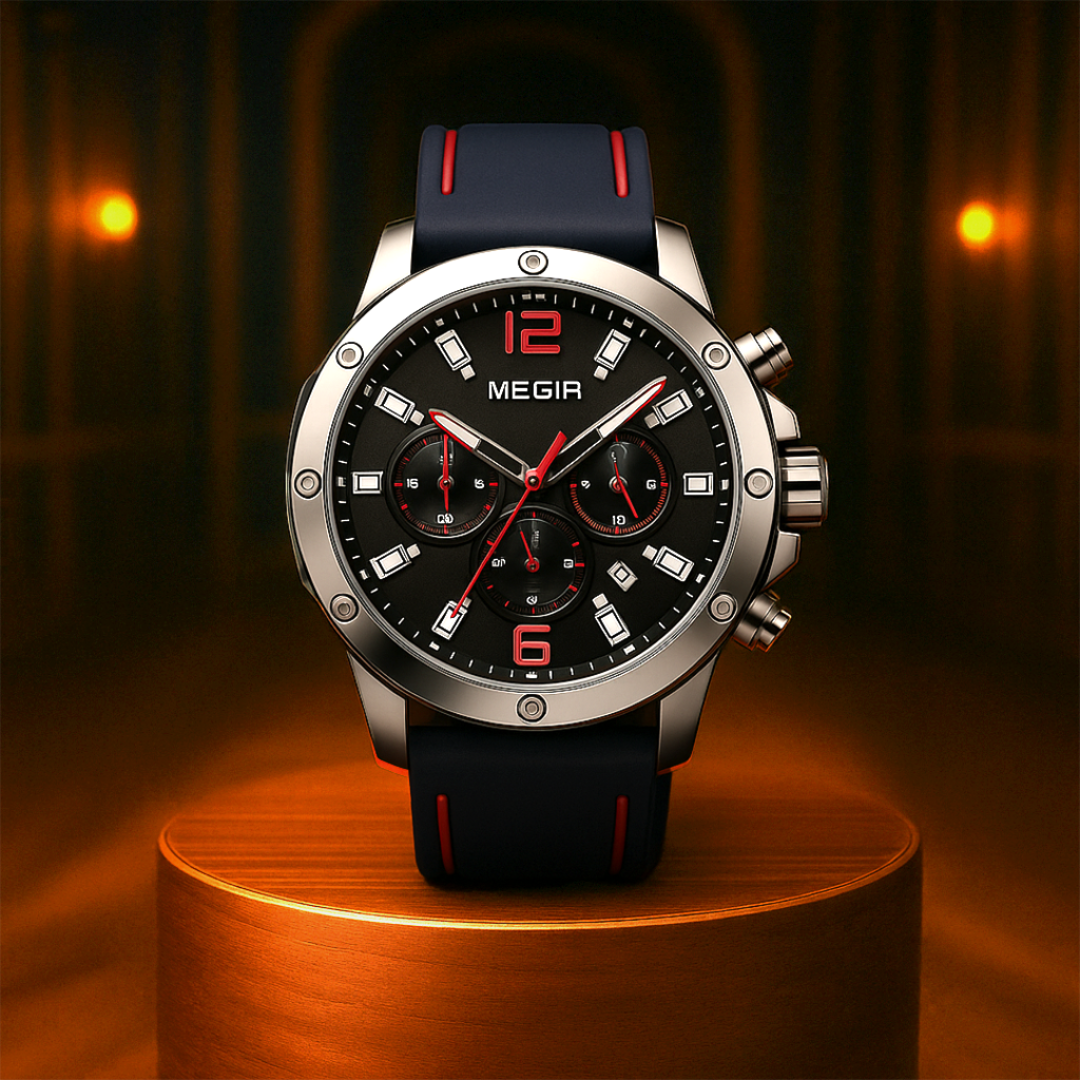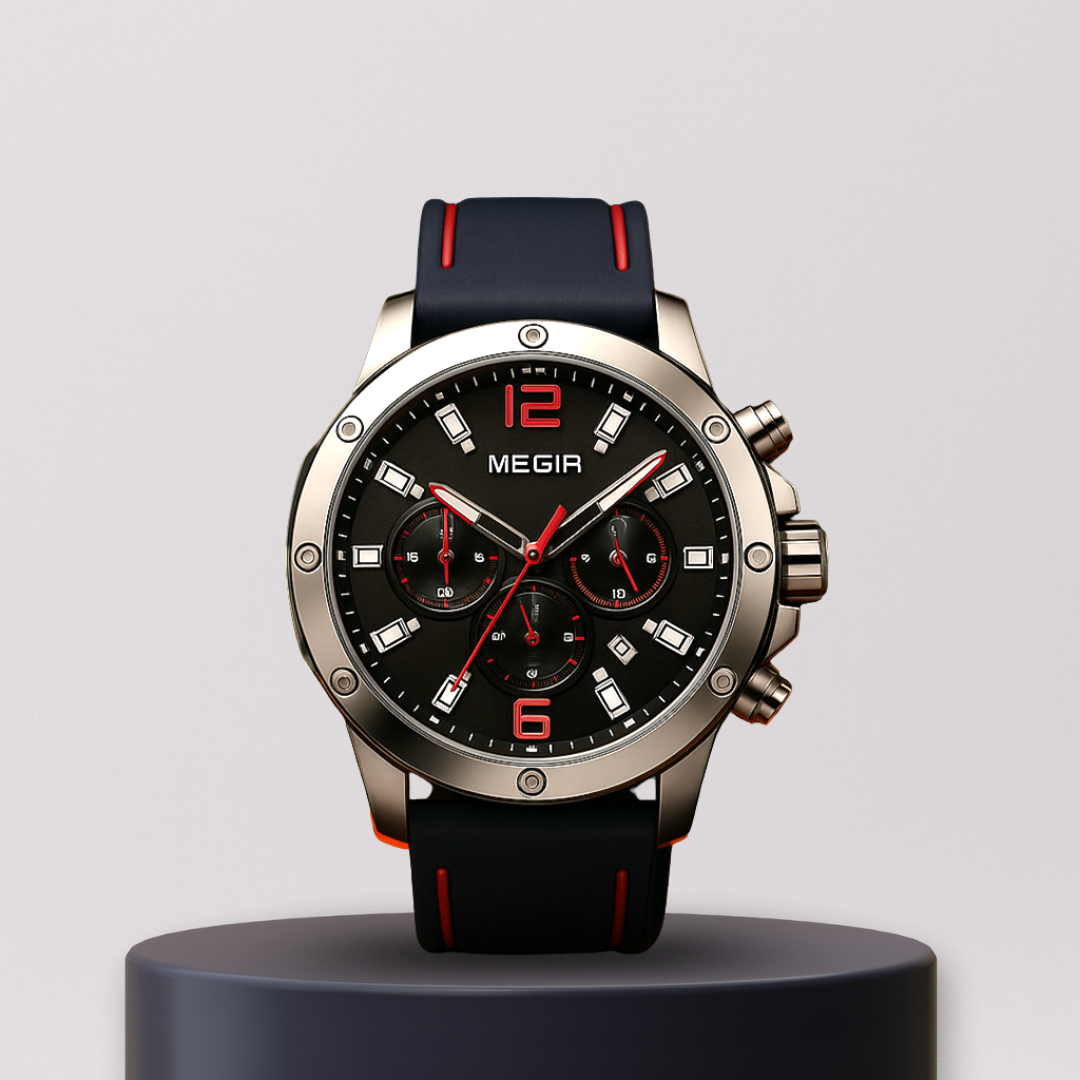 Brushed stainless-steel case with exposed bezel screws, housing a jet-black dial accented in race-red. Bold Arabic numerals at 12 and 6, triple subdials for split-second timing, and luminous baton markers for night legibility. Fitted with a black silicone strap featuring red inlays, built for comfort at high speeds and durability in all conditions.