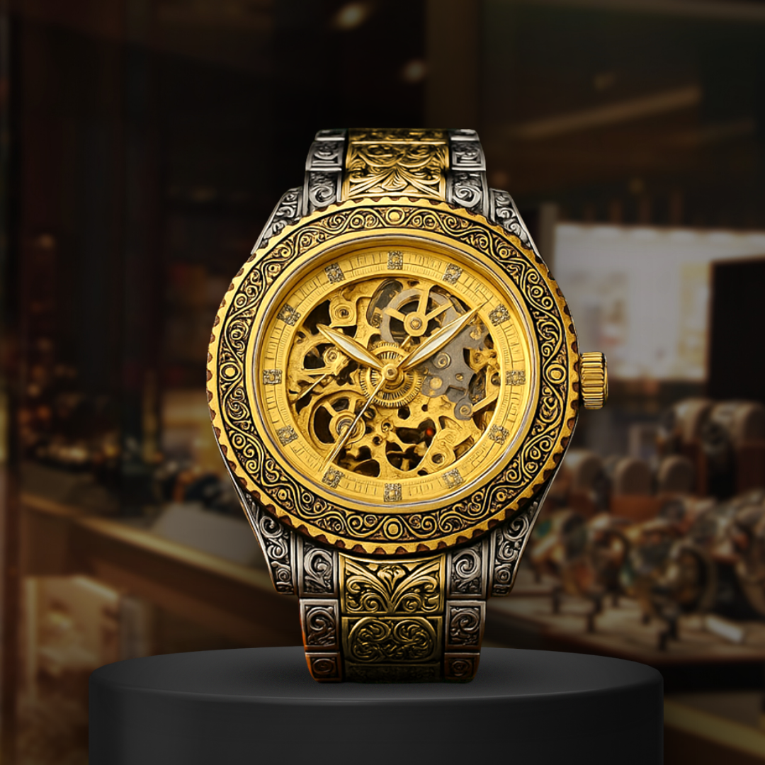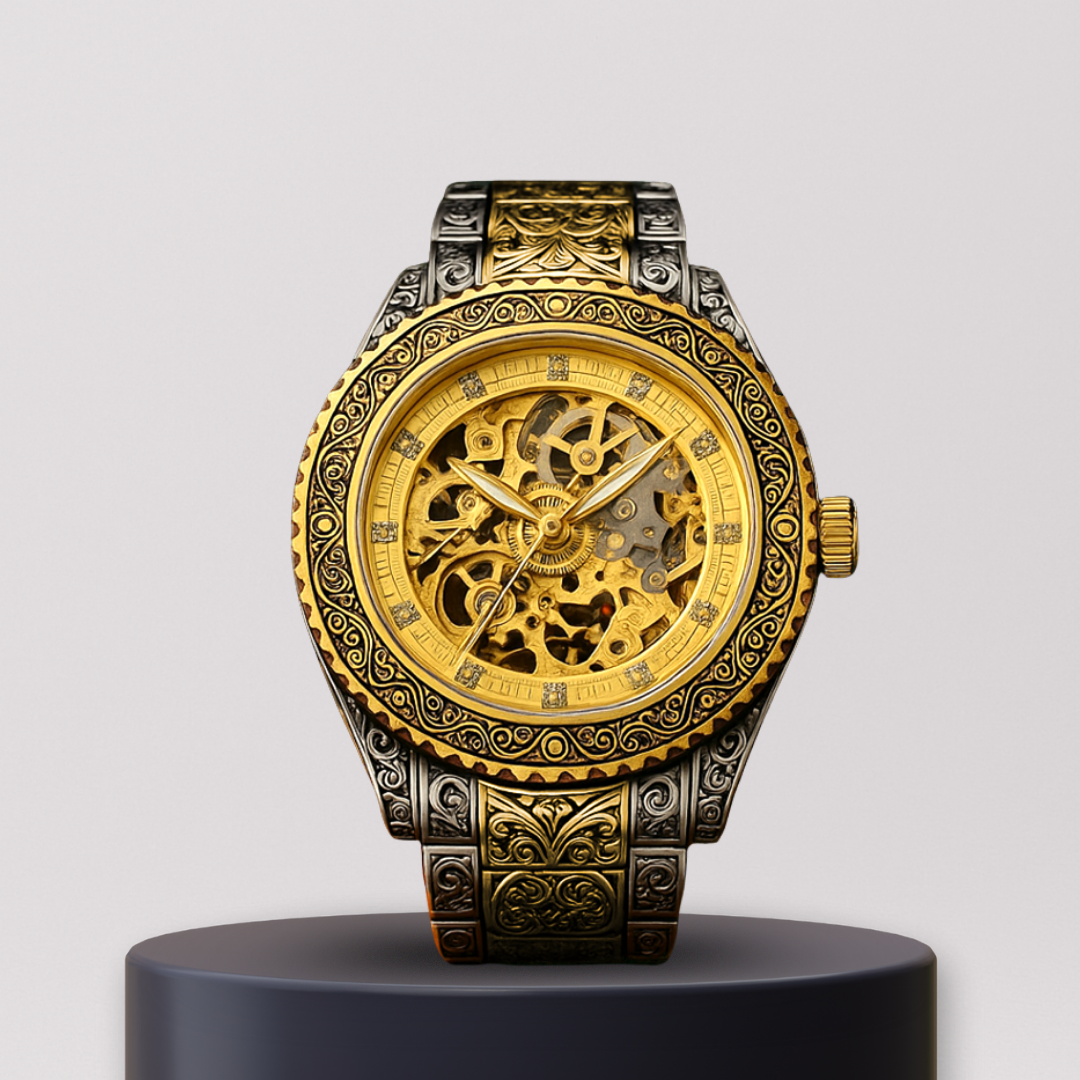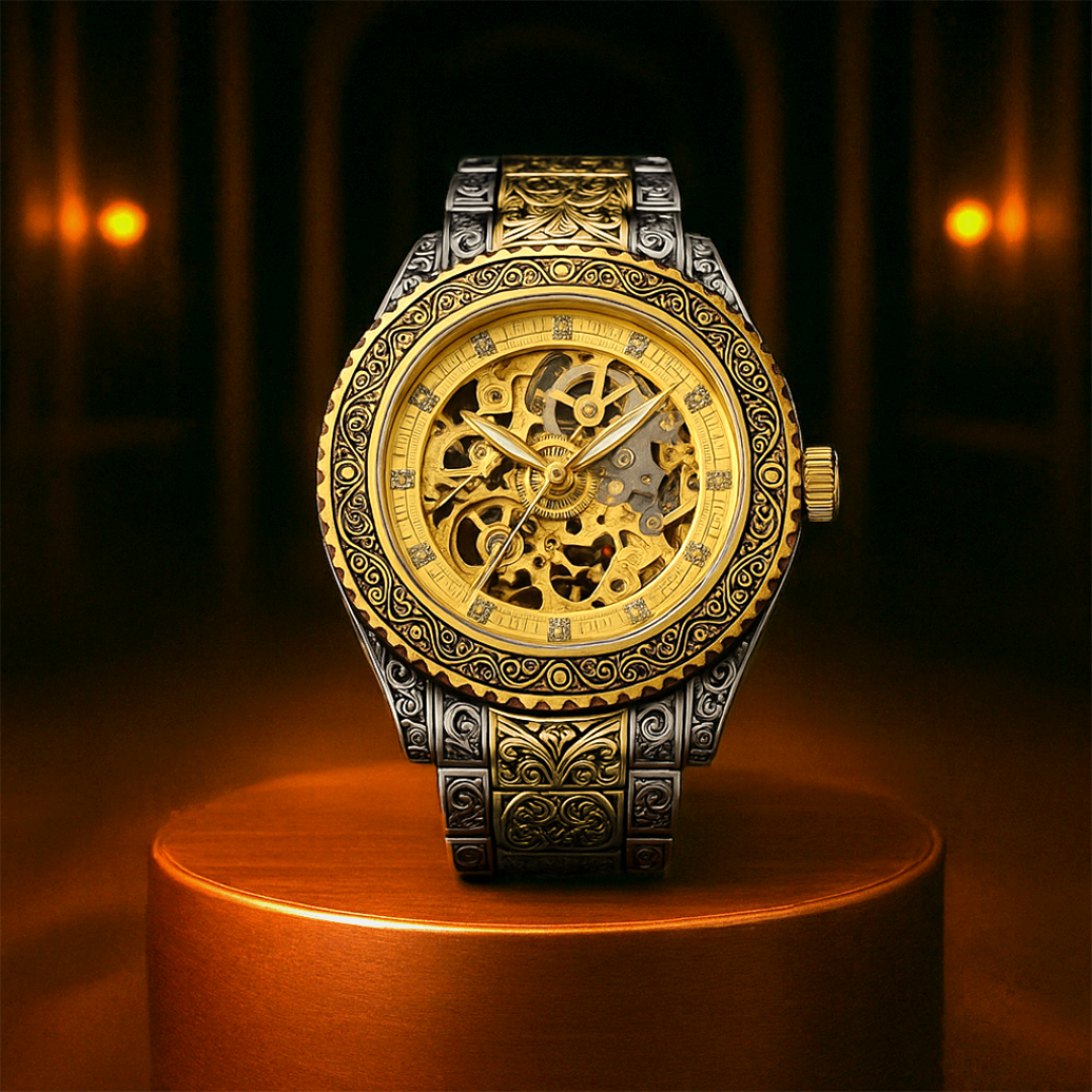 The Imperial Skeleton Guard showcases a fully openworked golden dial framed by an ornately engraved case and bracelet in contrasting steel and gold tones. Every bridge, gear, and jewel is visible, celebrating mechanical artistry. Built for those who value craftsmanship as much as command, it’s a timepiece where engineering becomes regalia.